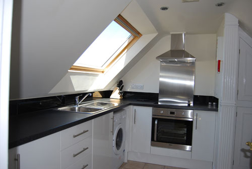 white units having black granite effect melamine working surfaces. Fittings include an inset single drainer stainless steel sink unit with mixer tap. Ceramic four ring hob with stainless steel splash back and stainless steel electric extractor hood over. Under counter Beco washing machine. An additional working surface to the other side of the kitchen houses beneath a Beco refrigerator and Beco freezer. Built in store cupboards. Electric heated towel rail. Four recessed ceiling spot lamps. Electric ventilation. Six power points plus spurrs for appliances. Double glazed velux roof light.